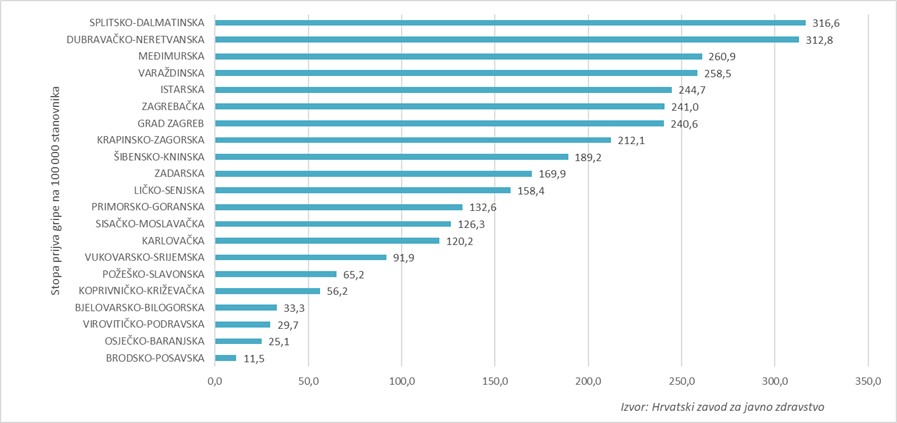 Prijave gripe zaprimljene su iz svih županija, pri čemu se u 50. tjednu najveća stopa prijava gripe na 100 000 stanovnika bilježi u Splitsko-dalmatinskoj i Dubrovačko-neretvanskoj županiji (grafikon 2.).