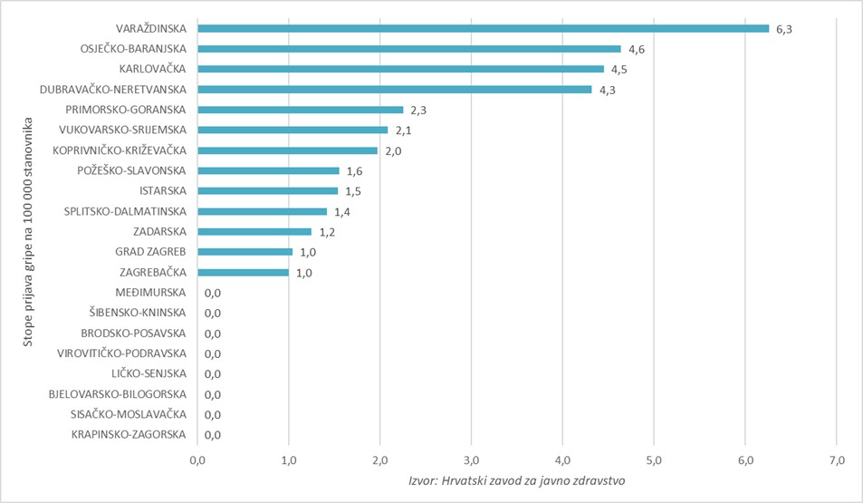 Prijave gripe zaprimljene su iz pet županija, pri čemu se u 10. tjednu najveća stopa prijava gripe na 100 000 stanovnika bilježi u Varaždinskoj županiji (grafikon 2.).