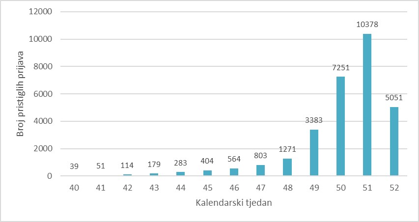 U Hrvatskoj je tijekom sezone gripe 2025./2026., zaključno s 28. prosincem 2025. godine pristiglo 29771 prijava oboljelih od gripe, od čega je 5051 prijava zaprimljena u posljednjem, 52. tjednu (grafikon 1.). Manji broj zaprimljenih prijava oboljelih od gripe u posljednjem tjednu vjerojatno je povezan s manjim brojem radnih dana a ne stvarnim padom broja oboljelih.