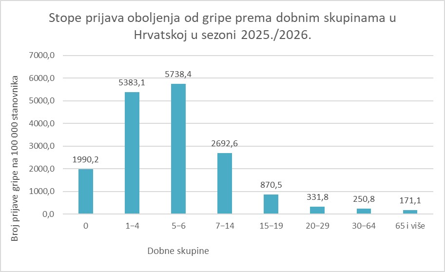 Grafikon 3. Kumulativna stopa incidencije oboljelih od gripe prema dobnim skupinama u Hrvatskoj u sezoni 2025./2026.