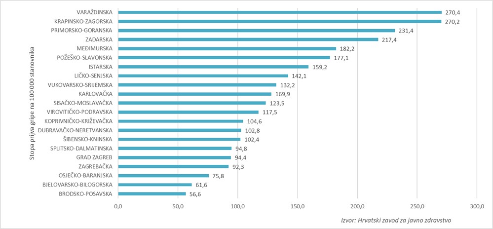 Prijave gripe zaprimljene su iz svih županija, pri čemu se u 52. tjednu najveća stopa prijava gripe na 100 000 stanovnika bilježi u Varaždinskoj i Krapinsko-zagorskoj županiji (grafikon 2.).
